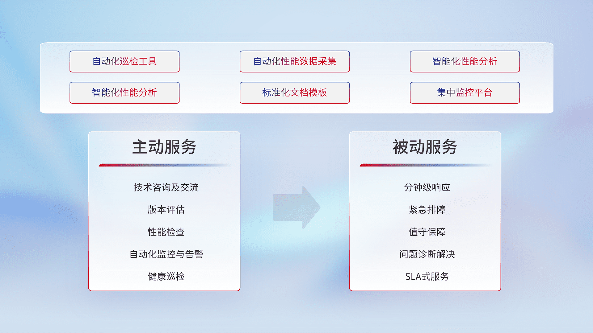 智能化工具和标准化文档,,,保障服务质量,,,提供主动服务(包含技术咨询、、、、版本评估、、、、性能检查、、自动化监控与告警、、、健康巡检)和被动服务包含(分钟级响应、、、紧急排障、、、、值守保障、、、问题诊断解决、、、、SLA服务)。。。。